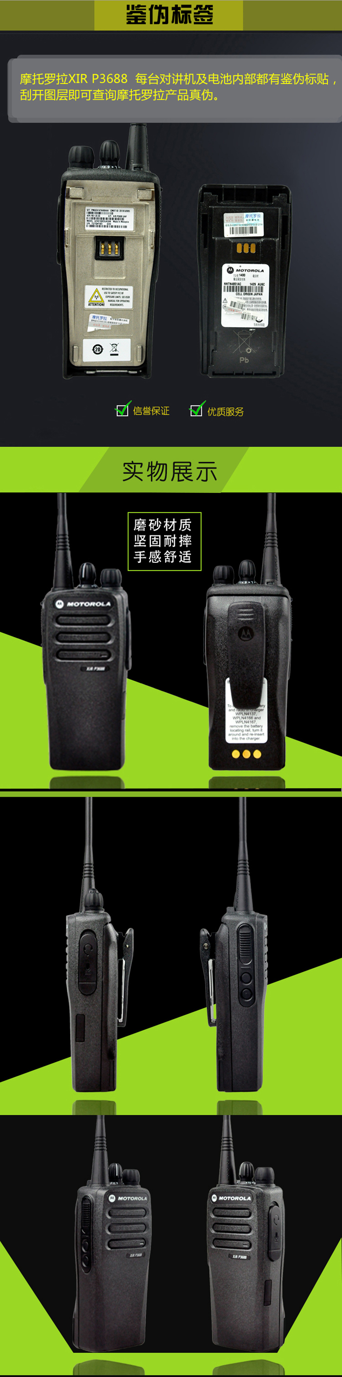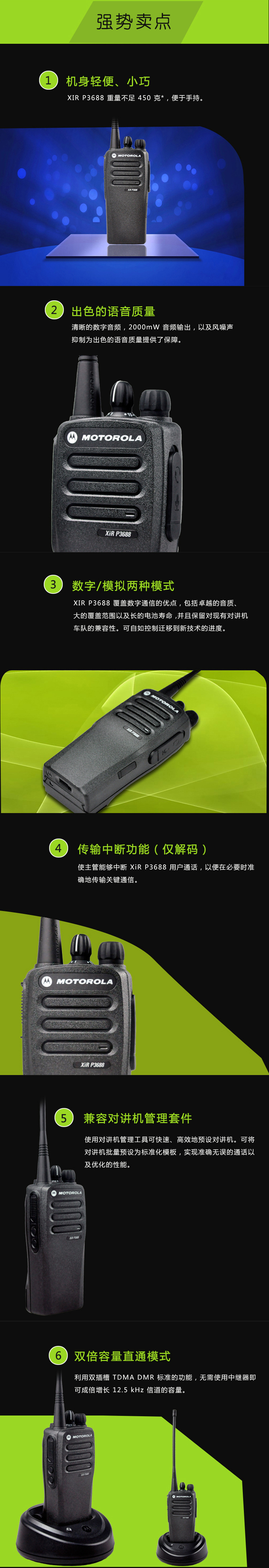 XiR P3688对讲机凭借易于使用的人体工程学设计和明快清晰的语音功能,可以使您的团队更加高效地开展工作。XiR P3688专门为兼具高效操作和高性价比的对讲通信需求设计,为此每台对讲机中都集成了摩托罗拉无线管理解决方案中卓越的团队管理功能。