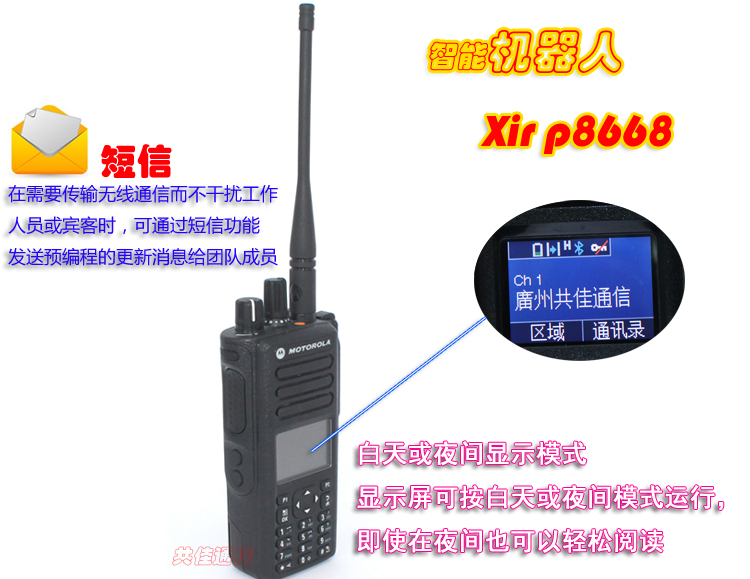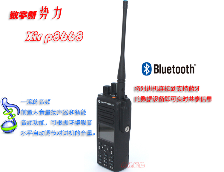 XiR P8668 便携式对讲机具有集成的蓝牙音频和数据功能*和集成式 GPS*,并借助智能音频和可定制的语音广播功能实现一流的音频效果,为您带来无与伦比的语音与数据通信体验。
